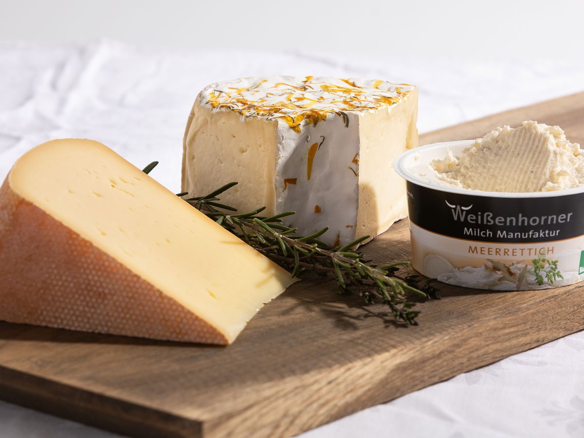 In unserem mittleren Paket planen wir für Sie immer eine Sorte Schnittkäse, eine Sorte Weichkäse und eine Sorte Frischkäse.