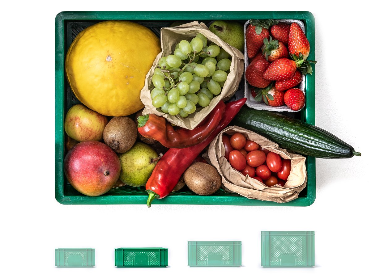 Enthält viel gesundes Bio-Obst und Rohkost aus überregionalem und im Sommer auch aus regionalem Anbau. Ein Grundanteil besteht meistens aus Äpfeln, Birnen und Bananen.