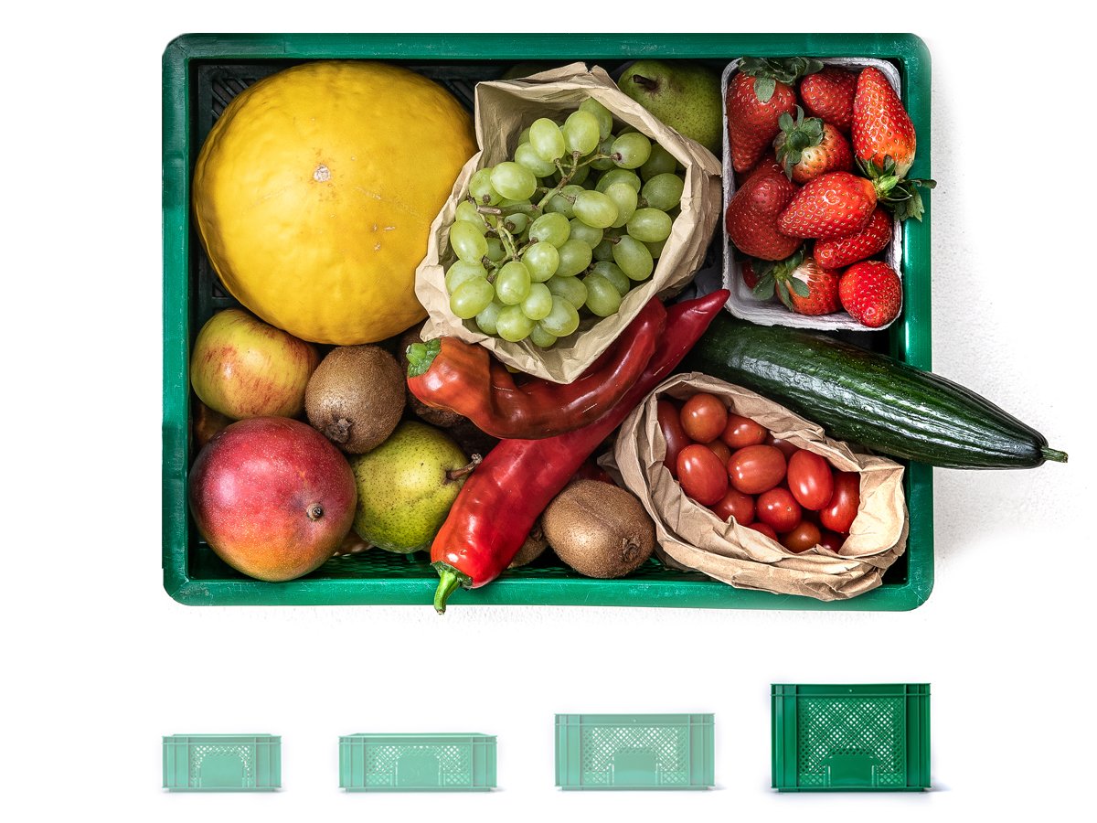 Enthält viel gesundes Bio-Obst und Rohkost aus überregionalem und im Sommer auch aus regionalem Anbau. Ein Grundanteil besteht meistens aus Äpfeln, Birnen und Bananen.