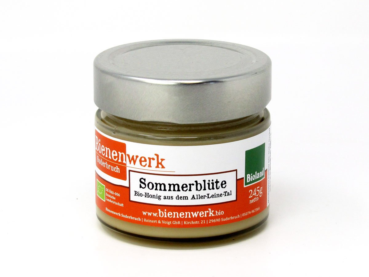 Unser Sommerblüten-Honig besitzt dieses Jahr auch einen Anteil Lindenblütenhonig. Aber auch Kornblume und Goldrute ist zu finden. Die korrekte Bezeichnung ist also Sommerblüte mit Linde. Ein etwas herberer Honig, feincremig und sicher eine Geschmacksoffenbarung auf dem Frühstücksbrötchen. Seine Farbe schimmert etwas grün, fluoreszierend.