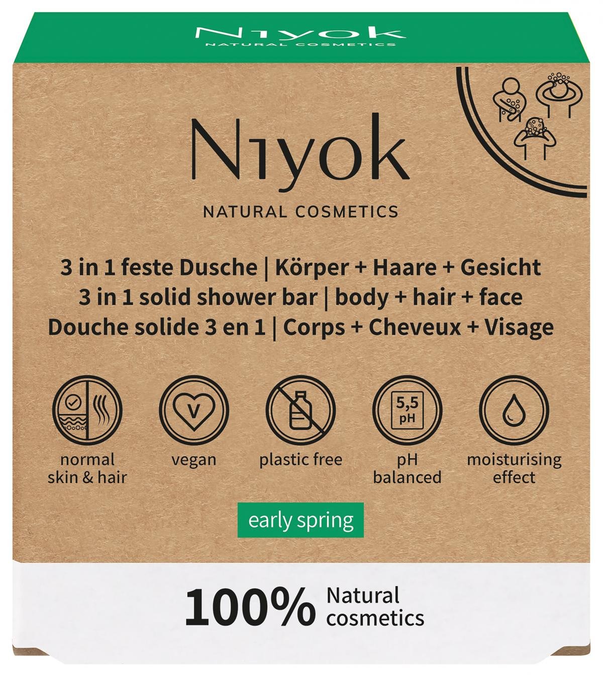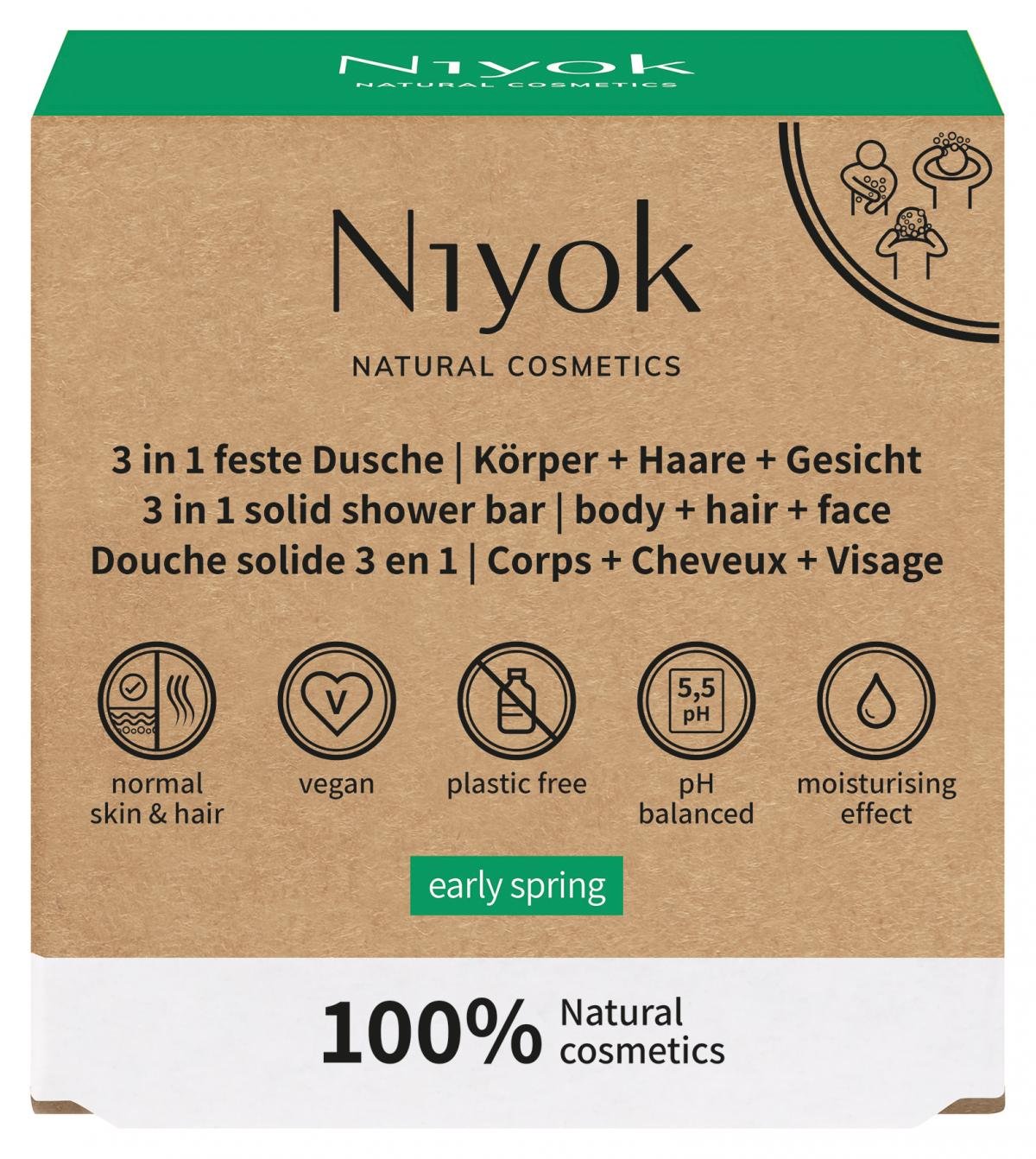 100% plastikfrei, 100% All-in-one: Die feste 3 in 1 Dusche von Niyok ist für den ganzen Körper geeignet und spendet aufgrund der Formulierung gleichzeitig reichlich Feuchtigkeit.