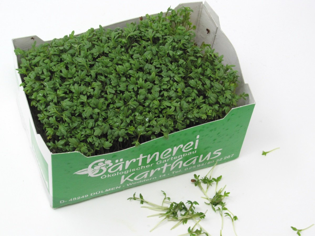 Kresse kann ganzjährig unter Glas oder auch in einer Schale im Haus ausgesät werden. Dafür reicht häufig ein feuchtes Küchentuch oder Watte als Untergrund aus. Die Keimung erfolgt innerhalb weniger Tage.