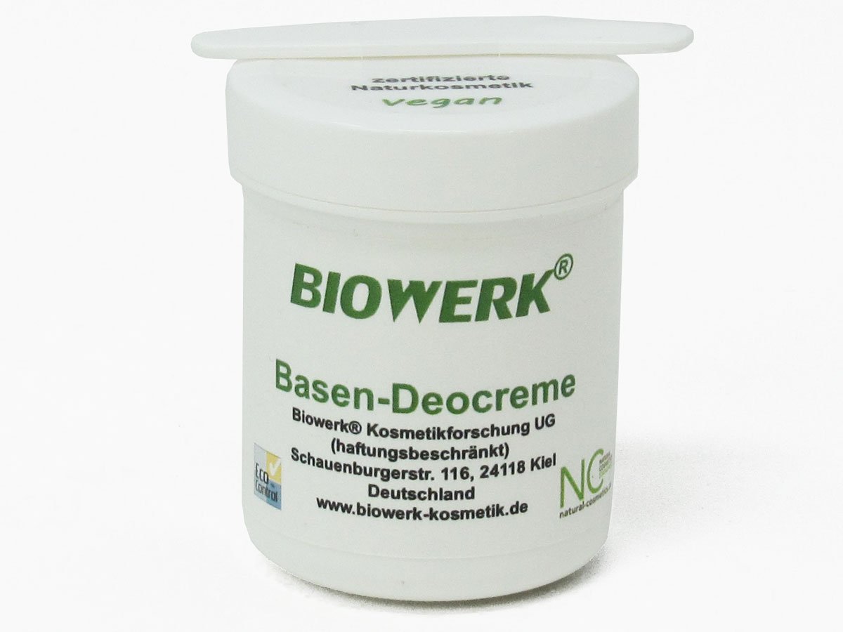 Der pH-Wert der Biowerk® Basen-Deocreme ist alkalisch. Die Base kann den sauren Schweiß neutralisieren. Die Vermehrung der Schweißgeruch produzierenden Bakterien kann durch das von der Basen-Deocreme erzeugte alkalische Milieu verringert werden. Die Reisstärke kann den Schweiß absorbieren. Bio-Rosmarinextrakt kann auch auf die Schweißgeruch produzierenden Bakterien hemmend wirken. Bio-Kokosnussöl gibt der Basen-Deocreme eine natürliche, dezente Kokosnussduftnote. Bio-Kokosnussöl, Bio-Sheabutter, Bio-Jojobaöl und Bio-Sonnenblumenöl können die Haut sehr gut pflegen. Die Deocreme enthält kein Zinkoxid und hinterläßt keine weißen Flecken auf der Haut.