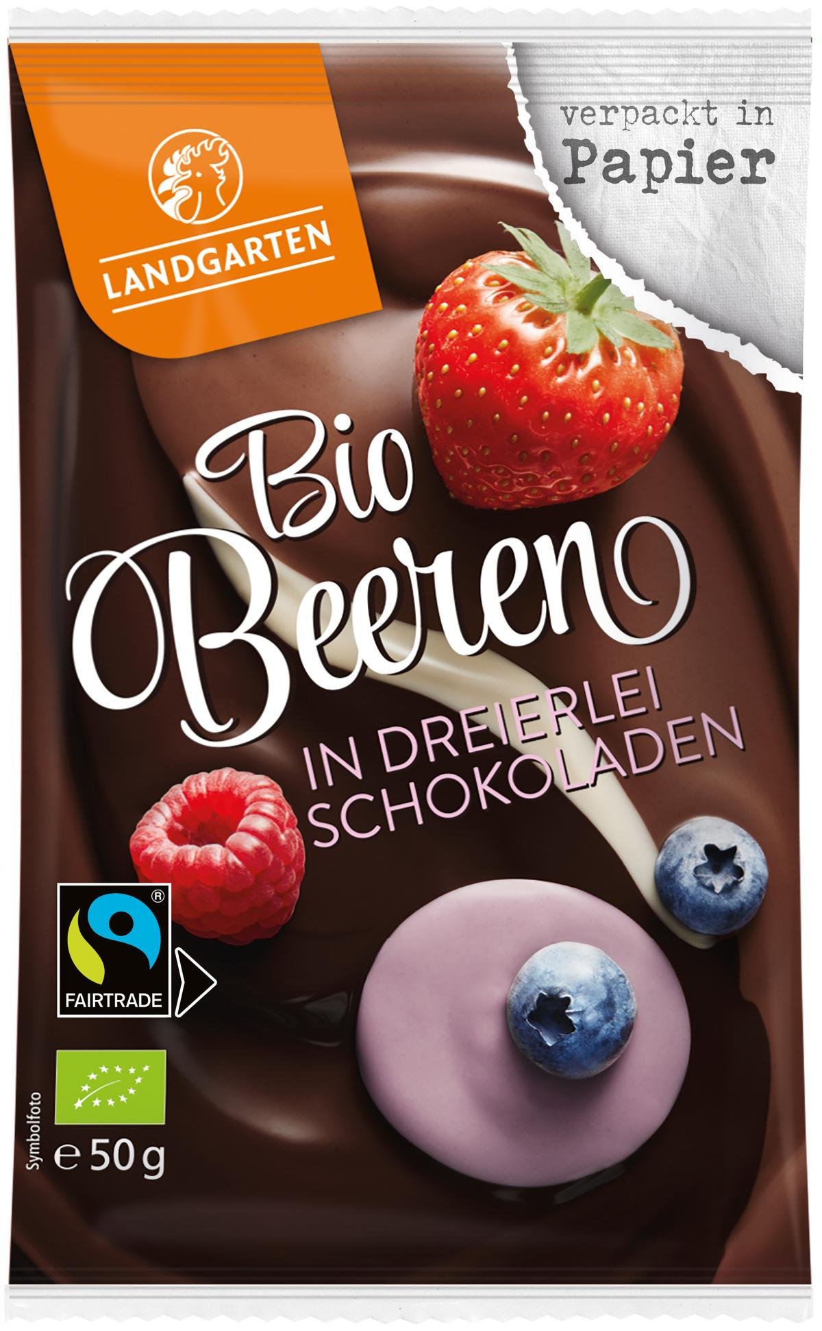 Zartbitterschokolade* 30% (Kakaomasse*, Rohrzucker*, Kakaobutter*, Kakaopulver stark entölt*, Emulgator: SOJALECITHIN*), Vollmilchschokolade* 30% (Rohrzucker*, Kakaobutter*, VOLLMILCHPULVER*, Kakaomasse*, Emulgator: SOJALECITHIN*), weiße Schokolade* 30% (Rohrzucker*, Kakaobutter*, VOLLMILCHPULVER*, Emulgator: SOJALECITHIN*), Heidelbeeren* 3%, Himbeeren* 3%, Erdbeeren* 3%, Überzugsmittel: Gummi arabicum*, Zucker*, Dextrose*, Holunderbeersaftkonzentrat*, Johannisbeersaftkonzentrat*, Heidelbeerpulver*.