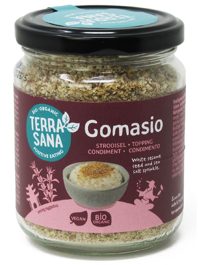Gomasio ist für die Japaner wie das Salz bei Tisch für Europäer. Eine leckere Prise gerösteter und leicht zerstoßener weißer Sesam mit Meersalz. Du kannst dieses erschwingliche Topping wirklich auf oder in allem verwenden: von Marinaden bis (Miso-) Suppen und ganz toll eignet es sich für alles in der schnellen Küche. Probiere auch Furikake (mit schwarzem und weißem Sesam und Meeresalgen).