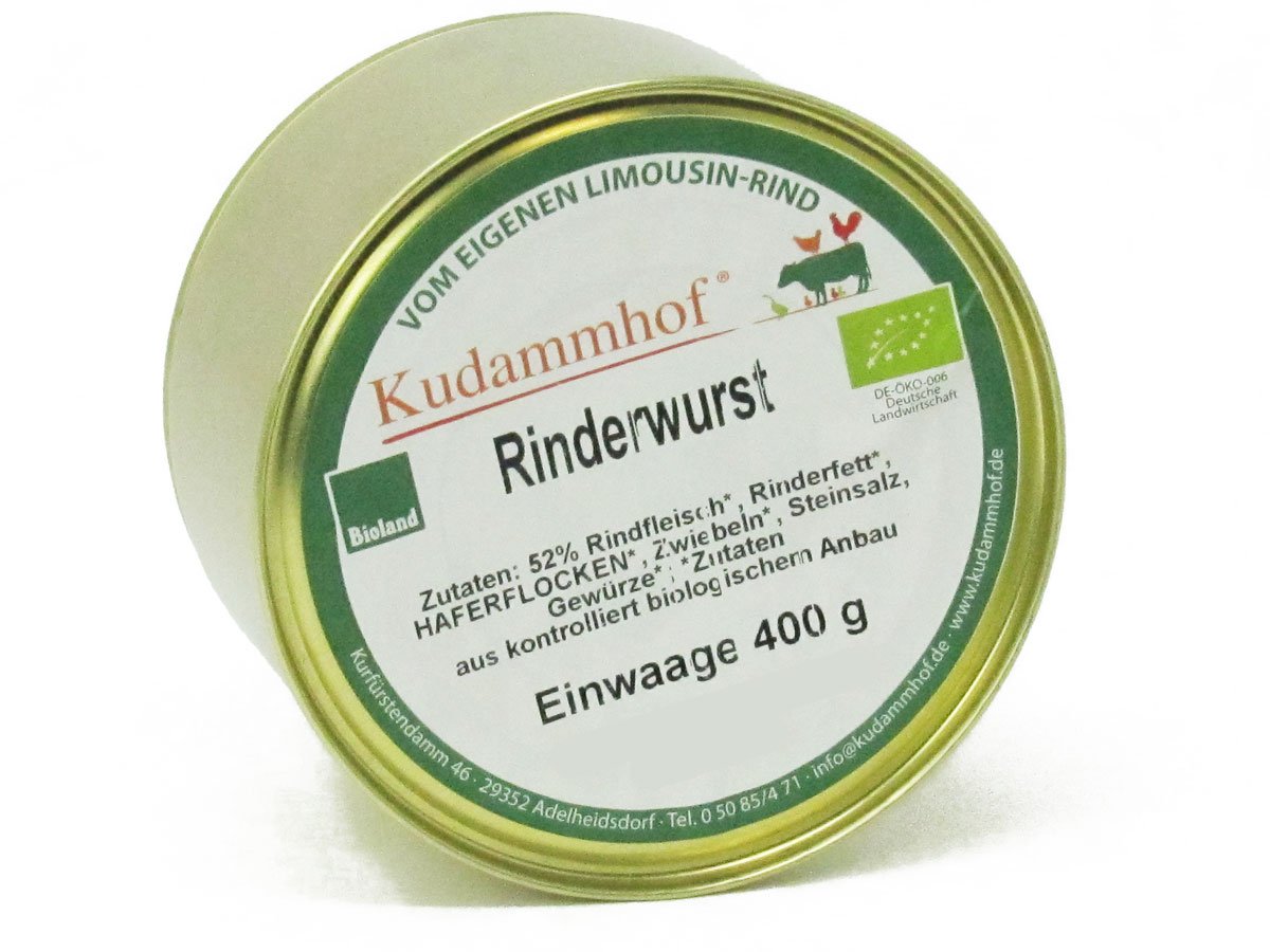 Diese leckere Dosenwurst kommt regional vom Kudammhof. Er hält neben seinen Legehennen auch Rinder auf den Weiden rund um Adelheidsdorf bei Celle. Die Tiere wachsen langsam auf, mit viel eigenem Rauhfutter und Weidegang. Die Dosen-Wurst wird handwerklich hergestellt und es wird weitgehend auf Zusatzstoffe verzichtet.